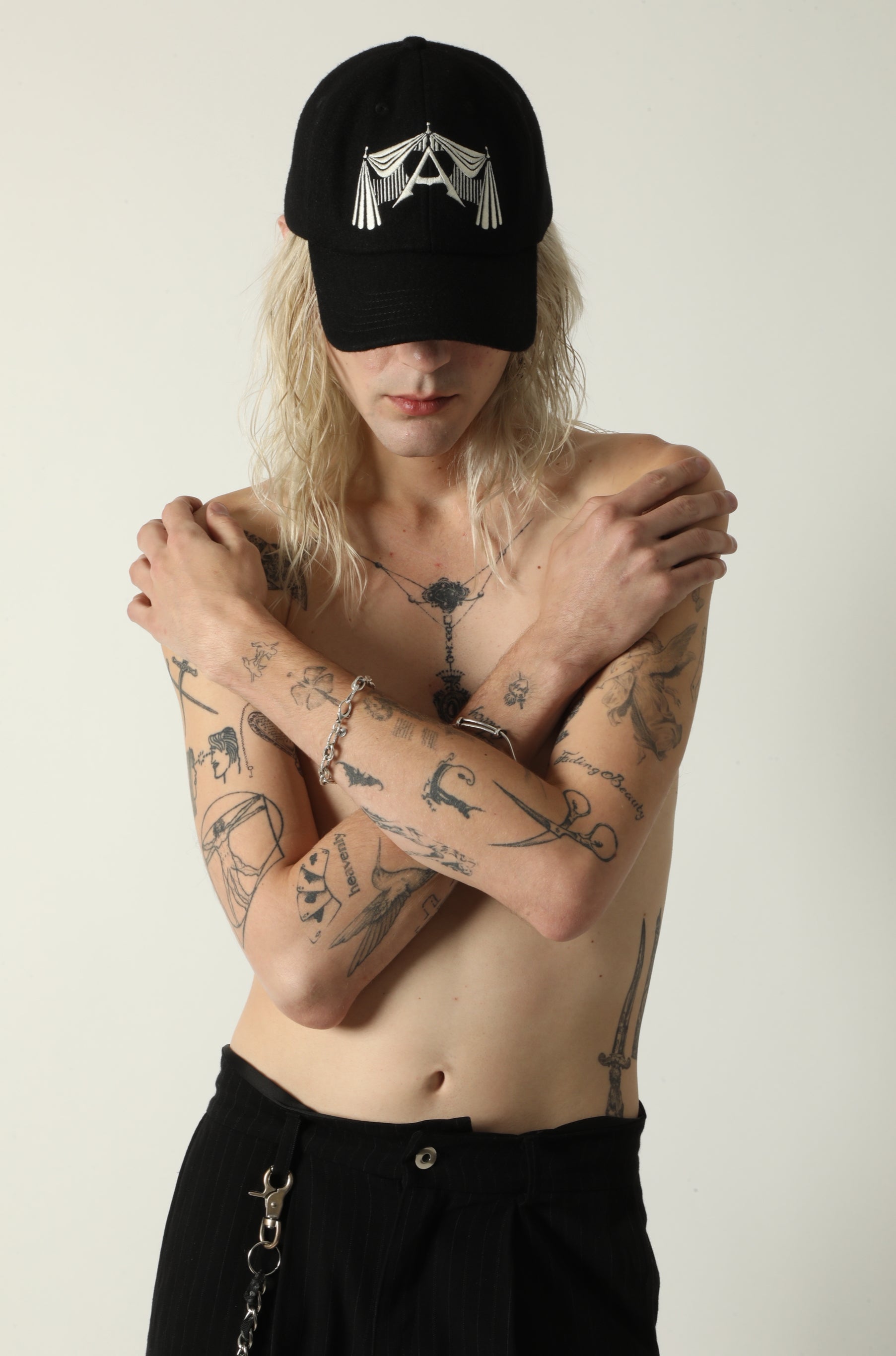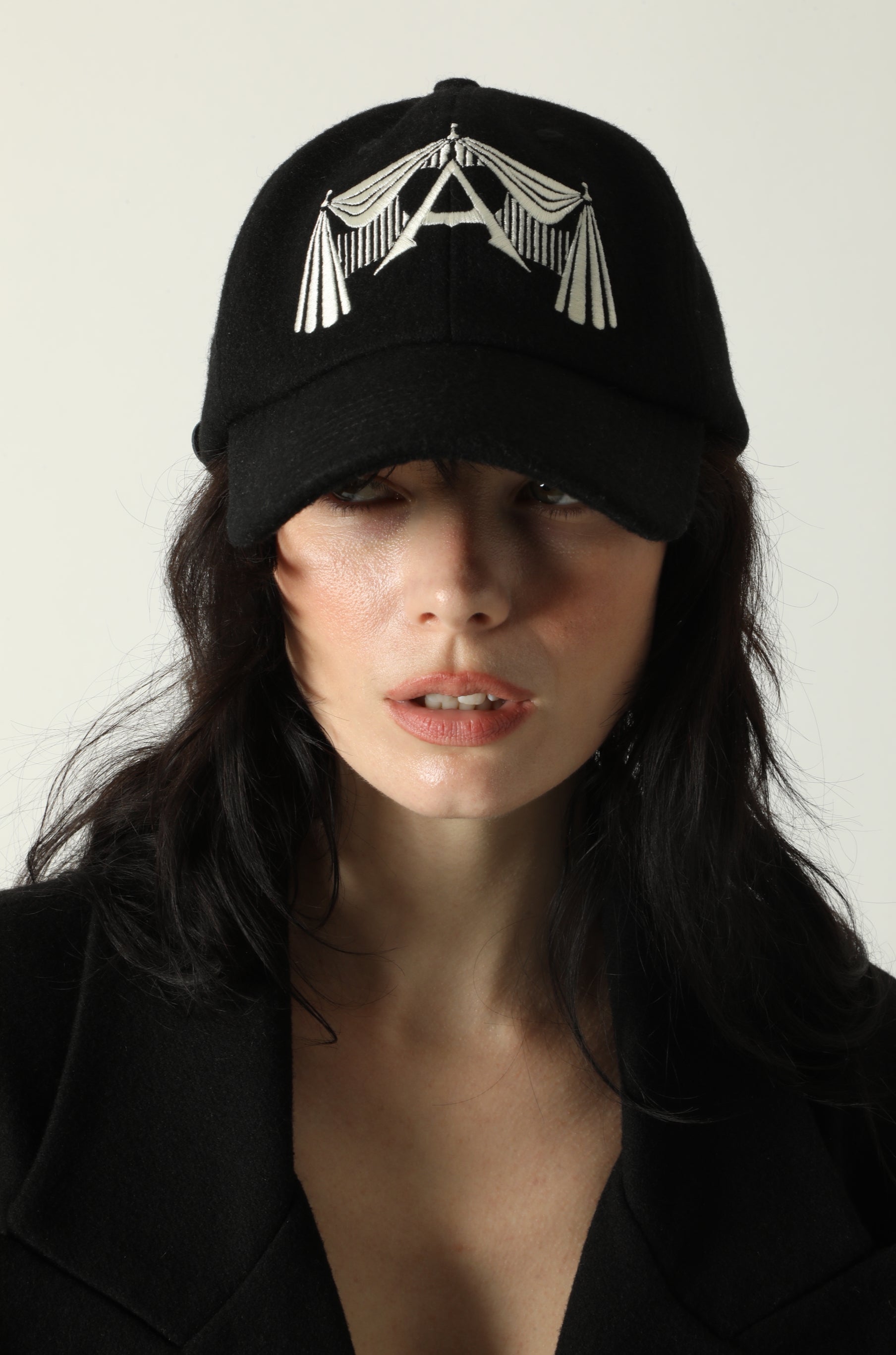 6-PANEL BASEBALL CAP IN 100% WOOL. EMBROIDERED ARTWORK AT FRONT AND BACK. ADJUSTABLE COWHIDE LEATHER STRAP. GUN METAL BUCKLE IN BACK.
